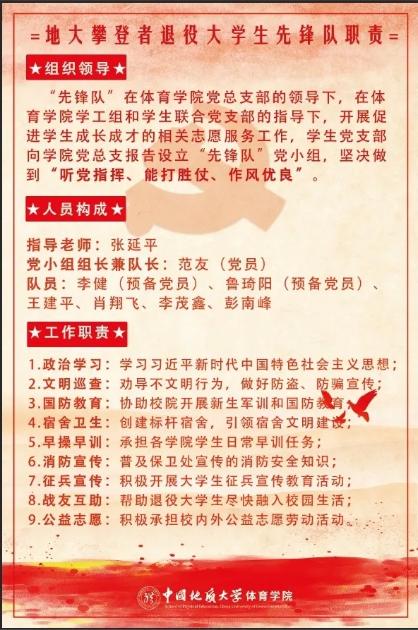 虽然这几名退役军人已经离开部队,但军人“退役不退色”,在伟德体育 党总支的领导下,在伟德体育 学工组和学生联合党支部的指导下,开展促进学生成长成才的志愿服务工作。地大攀登者退役大学生先锋队的队员们要在理论武装、行为养成、学风建设、校园文明和国防教育等方面发挥标杆作用。