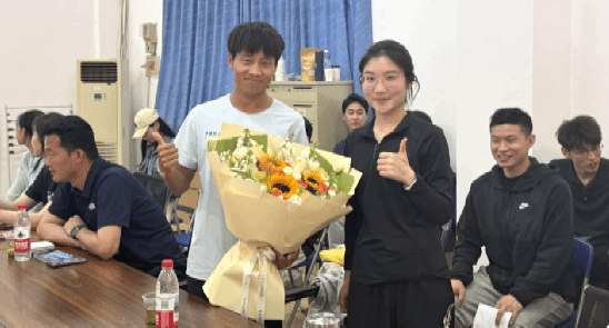 学生代表李琪为何杰献花,表达在校学生对他取得佳绩的祝贺。