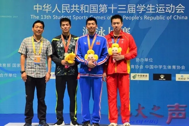 闫子贝(右二)代表学校参赛并获得男子乙组200米自由泳冠军